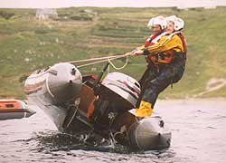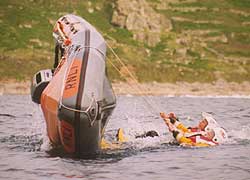 | ILB Capsize Training. Firstly the boat is capsized by three Crew Members standing on one side with a rope rigged to the opposite side...... Then is is righted by rigging a rope and lying in the water as shown !!...... images : Tim Stevens |