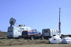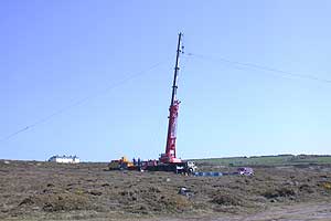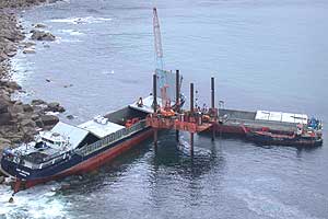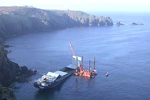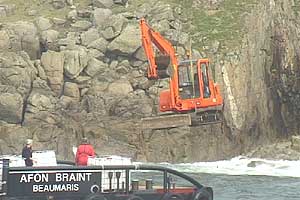 Thursday 10th April - it was hoped to remove the jack-up rig from the site today but the swell prevented this ; here an excavator, which had been used in the ship`s hold, is transferred to the tug Afon Braint. Today was a fine, quiet day and this swell is routine and low by local standards. The seaward operation is too hazardous for the rig - and there are now fears for its safety due to adverse forecasts and large spring tides next week. (these two images videograbs). | |