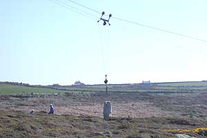 wire system rigged up over the cliff to the ship. The 1 ton bags of cargo are slowly winched up (indicated with white line) to the cliff top. |