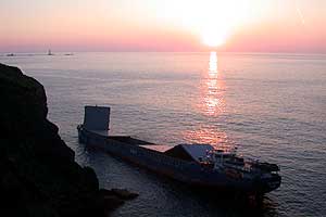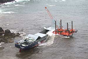 Sunday 6th April - a jack-up rig is positioned alongside the wreck this morning in ideal conditions - a barge is also on site and presumably will moor alongside the rig - allowing the cargo to be trans-shipped - more images later. | |