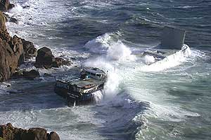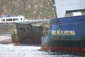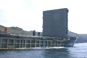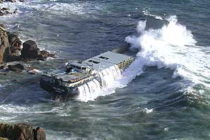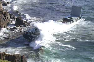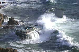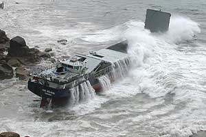 19th May These are the worst conditions since the ship grounded - though still only wind sea. On this evening`s high water when these images were taken, the ship was pounding and grinding and swinging quite a lot and clearly an awful lot of damage was being done. It seems that most, if not all, the cargo is now either removed or washed out. |