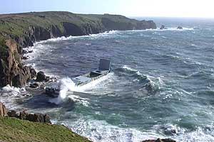 Friday 2nd May at high water. The ship is moving significantly. Gamper bay has a large slick of dirty water extending nearly to Land`s End. |
